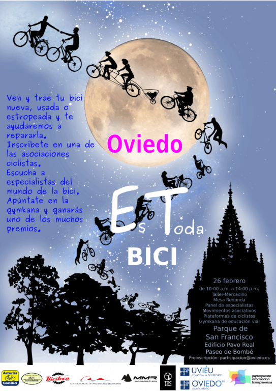 El próximo domingo día 26 se celebrará "OVIEDO Es Toda BICI". Evento promovido por el equipo de Participación Ciudadana, el Área de Deportes y el de educación Vial de la Policía Local del Ayuntamiento de Oviedo. Asturies ConBici, y otros amantes de las dos ruedas, colaboran en esta iniciativa, donde disfrutaremos de interesantes actividades que se realizarán entre las 10:00 y las 14:00h en el Campo San Francisco de Oviedo.