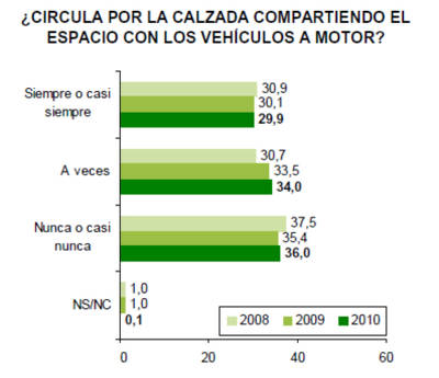 Todas esas expresiones están enraizadas en un erróneo planteamiento técnico y político de las medidas de promoción de la bicicleta, que luego será descrito con mayor detalle. Pero lo que realmente está visibilizando el conflicto, en alarmante crecimiento, es el uso ciclista del espacio peatonal y, en particular, de las aceras. Son oportunos a este respecto los datos del Barómetro Anual de la Bicicleta en España, los cuales indican que más de un tercio de los ciclistas no utilizan nunca o casi nunca las calzadas. Preguntados éstos sobre los motivos por los cuales no emplean las calzadas, la mayoría indica que «es peligroso o le da miedo». Estos datos, más la observación directa de numerosas ciudades españolas, permiten estimar que más de una tercera parte de los nuevos ciclistas incorporados a la movilidad en los últimos años están empleando sobre todo las aceras para circular. Obviamente, la propensión y frecuencia de la circulación por aceras tiene variaciones en función de la tipología urbanística y de la cultura y política de la bicicleta existente en cada ciudad, pero cualquier observador puede apreciar que se verifica en todas las ciudades y en cifras de ese calibre tan elevado. Hay que decir también que este conflicto en el espacio peatonal se superpone a otros que ya están presentes o se anuncian, como el aparcamiento y la circulación de motocicletas y ciclomotores, la circulación de segways y patinetes con motor de adultos, o la expansión de terrazas y muebles de restauración derivada de la Ley Antitabaco. Las aceras suscitan apetencias insaciables. Lo que une a viandantes y ciclistas..., y lo que les diferencia viandante. - com. Persona que viaja a pie.