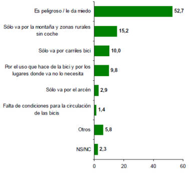 Fuente: Elaboración propia a partir de los datos de las encuestas Movilia 2000 y 2006 (1) Hábitos de circulación de los usuari@s de la bicicleta en España y motivos que aducen los que no circulan por las calzadas: Ilustraciones sobre algunos errores de diseño: | El trazado de la vía ciclista acaba devorando la acera por no cuestionar la anchura de la calzada en la rotonda | La vía ciclista se proyecta y ejecuta sin considerar las necesidades del itinerario peatonal paralelo para el que no se habilita cruce ni rebaje de bordillos | | Acumulación de errores de diseño: la marquesina ocupa la acera, los automóviles aparcados el lugar de parada del autobús y los viandantes la vía ciclista | Acera bici bidireccional que ocupa el paseo peatonal en una calle con carril único de circulación y doble banda de aparcamiento |