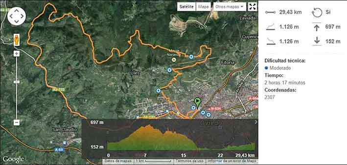 Es una ruta circular de 30Km con subida inicial por carretera al Cristo del Naranco, se proseguirá por el Pevidal hasta la parte alta de Brañes, de aquí se baja al Nora y por su vera pasando por Rodiella a Puente Gallegos y ya por la AS 232 carretera tranquila a Oviedo.