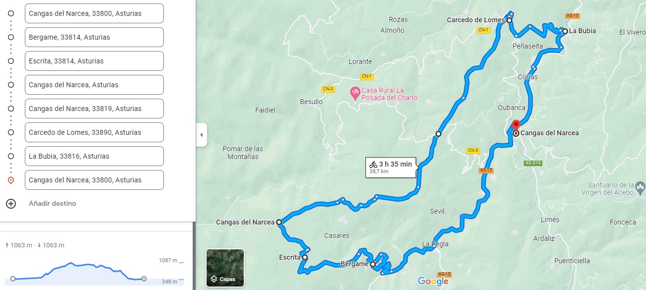 Primeramente cogeremos la AS-15 dirección Rañadoiro durante 10km. Después comienza la subida (10km) por carretera secundaria y después pista. Después nos descolgaremos suavemente hasta el río Narcea por pista y en su última parte camino.
