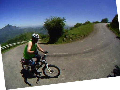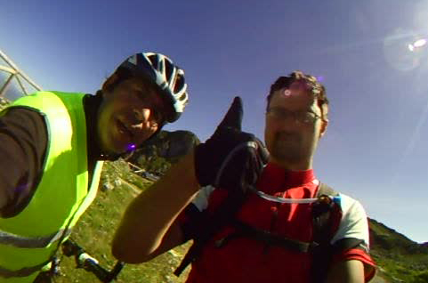 Gracias Manu: Hicimos más de una parada al bajar, entre ellas, la de la curva de abajo de la cueña les cabres, y efectivamente, en ese punto la capacidad de frenada de la bici se había reducido al mínimo. Como se puede ver en el vídeo, en el minuto 1:00 casi me empotro contra el trasero de una vaca. La vaca, dándose cuenta de la situación y con el olor a estofado que salía del disco del freno, soltó un mugido de protesta (1:08). Le aviso a Katelme del olor a quemado de los frenos (1:13), y él, pensando que me refería a los suyos, se pega un buen rato revisando si todo va bien antes de continuar con el descenso.