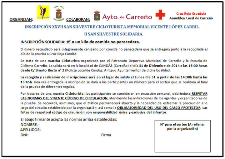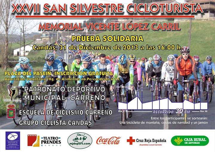 San Silvestre de Candás 2013 (0 viendo) Las actividades y/o salidas cicloturistas aquí propuestas se consideran EXTRAOFICIALES a las propuestas por Asturies ConBici y por tanto no se rigen por la normativa establecida para las actividades de la asociación ni tampoco tenemos ninguna responsabilidad en ellas. Tan solo hacemos de medio intermediario a quien las propone. Aquí puedes proponer actividades de cualquier índole, siempre que estén relacionadas con la bicicleta. En la medida de lo posible intentaremos que no se solapen con las propuestas por la asociación. Indicaremos nombre y fecha de la actividad (en el asunto) y una breve descripción de la misma como cuerpo del mensaje. Si podeis poner alguna foto mejor (ya sabéis.... por eso de ). Cumpliendo estos pasos... la asociación se compromete, en la medida de lo posible, publicitarla por nuestros canales oficiales.