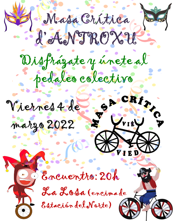 La Masa Crítica de marzo va a ser un evento muy especial, celebraremos el Antroxu sobre ruedas, llenando las calles de colores, música y diversión. Así que te animamos a que vayas preparando tu disfraz para participar en esta masa crítica divertida y colorida. ¡Teníamos muchas ganas de volver a disfrazarnos sobre ruedas! Nos encontraremos, como siempre, en la Losa a las 20h, encima de la estación de tren. Porque queremos transformar Oviedo en una ciudad centrada en las personas y no en los coches. Únete a esta reivindicación lúdico-festiva que subvierte el "cochismo" y visibiliza la bici como medio de transporte y filosofía de vida. Por una ciudad más amable y sin malos humos. Este primer viernes de mes, como cada mes, únete a la masa crítica d'Uviéu. Tráete unx amigx, cuanta más gente seamos, ¡mejor!