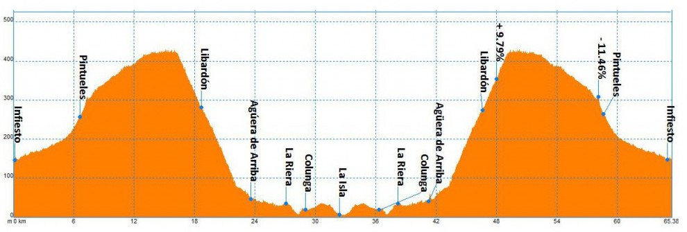 La vuelta desde La Isla será por la misma carretera y es el tramo que presenta mayor dificultad, sobre todo los 5 kilómetros antes de llegar al alto (con una pendiente media en torno al 5,8%), pasado Libardón, por lo que habrá que tomárselo con calma. El chigre-tienda La Nava es famoso por sus patatas a la bicicleta en dicha localidad. También el centro de interpretación sobre el Gaitero de Libardón. Para los que no quieran hacer este tramo de vuelta, existe una alternativa más favorable pero más larga. Es hacer los 20 kilómetros que separan La Isla de Ribadesella por la N-634 pero con el inconveniente de que hay que ajustarse al tiempo para coger el último tren regional de las 18:52. También, al ser un tren regional, SOLAMENTE pueden ir 9 bicicletas con las alforjas desmontadas. Perfil de la ruta.Recordatorios, anotaciones y enlaces.Eligan una u otra opción, los que vayan a coger el tren en Infiesto como los que escojan la alternativa de Ribadesella, tienen que decirlo ANTES DEL VIERNES porque el jueves por la tarde se cierra la gestión de trenes. Leer Más... | |