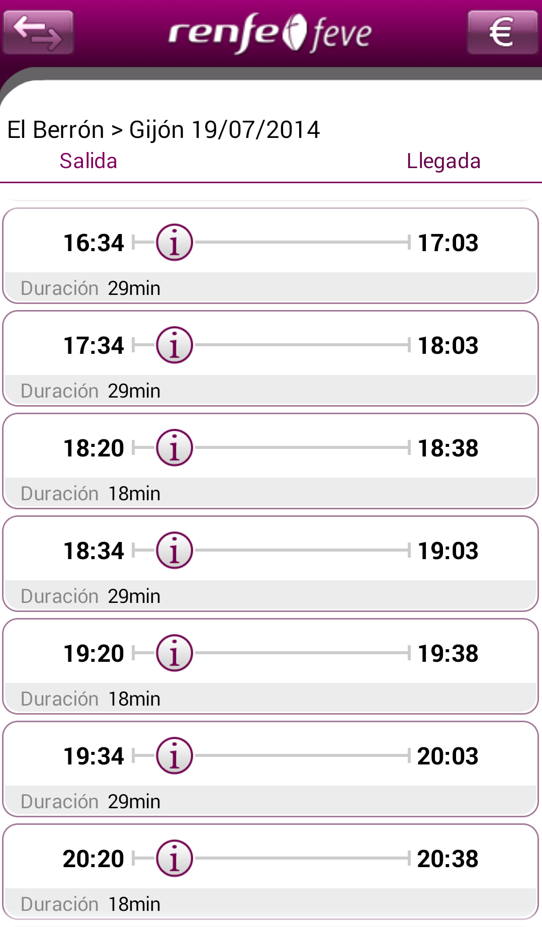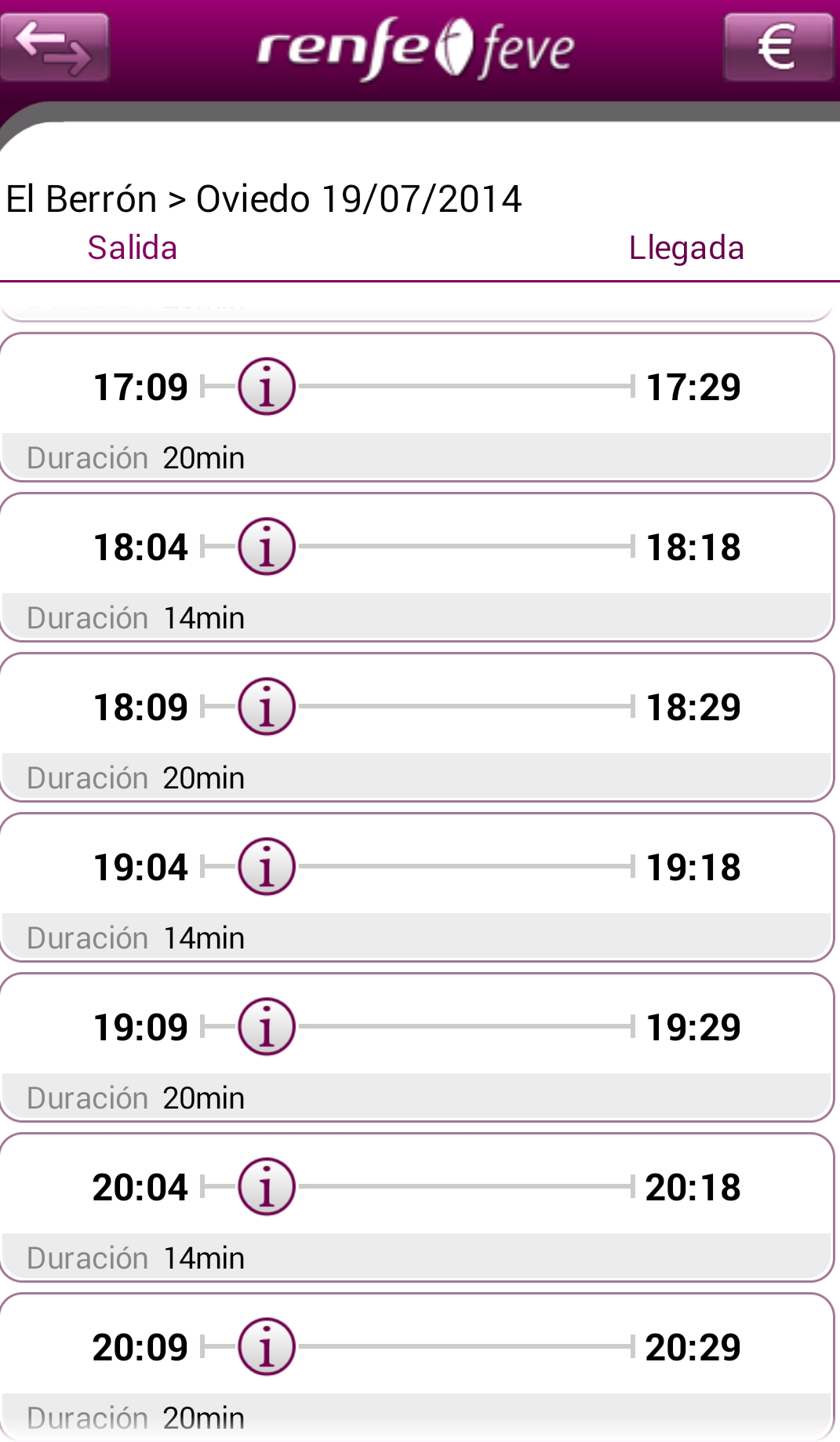 A la vuelta, desde El Berrón se dispone de dos servicios de FEVE cada hora tanto para ir a Gijón (a las y 34'; y a las y 20' el semidirecto) como a Oviedo (a las y 09 y a las 04' el semidirecto).