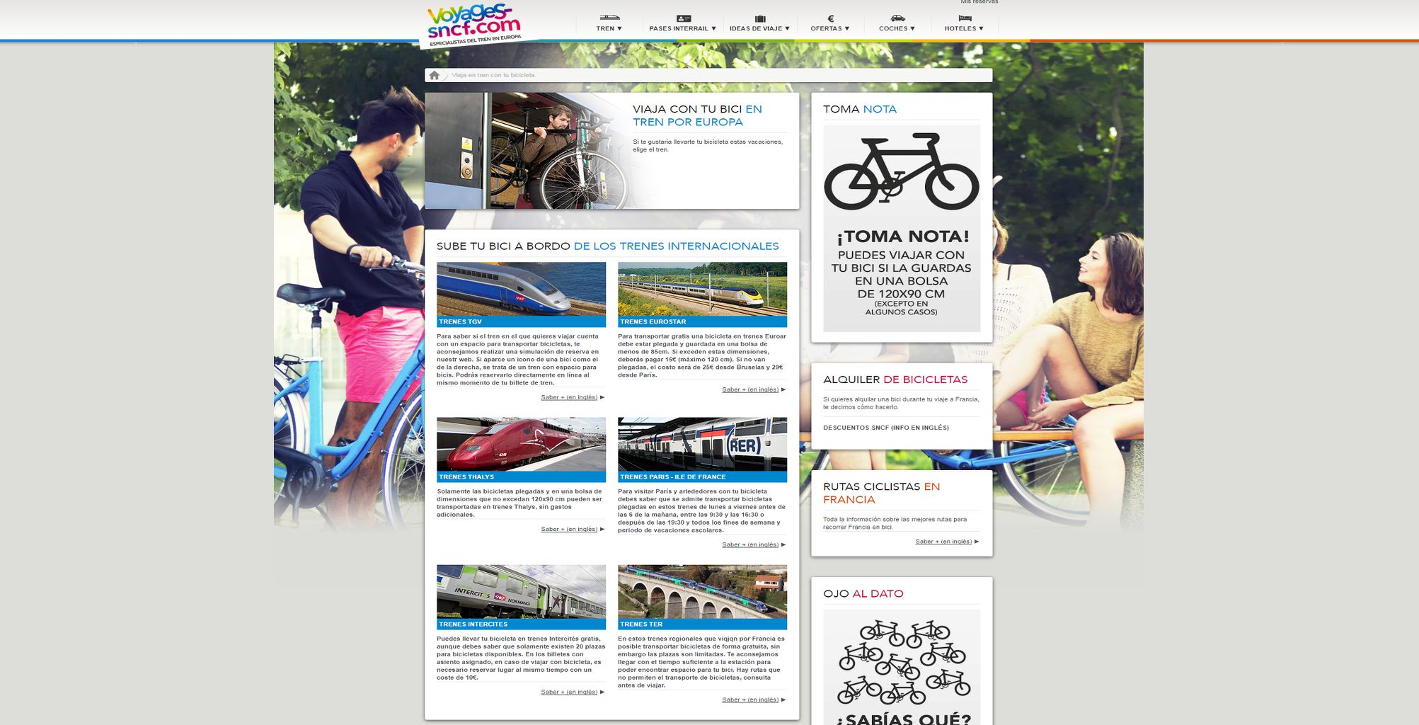 Si accedéis a la siguiente sección de la página web donde se adquieren sus billetes podréis comprobar como dedican todo un subdominio en internet (www.bikes.sncf.com) para fomentar el turismo por Francia a aquellos cicloturistas que así lo deseen y todo ello sin poner trabas ni ocultar información. Además proporcionan con un lenguaje claro y conciso a aquellos que quieran viajar por Europa de otra forma diferente... descuentos, información de las condiciones para llevar y/o empaquetar la bicicleta entre los distintos países, que trenes disponen sitio habilitado para bicicletas antes de adquirir tus billetes además de otras facilidades al considerar la bicicleta como cualquier otro bulto o equipaje.